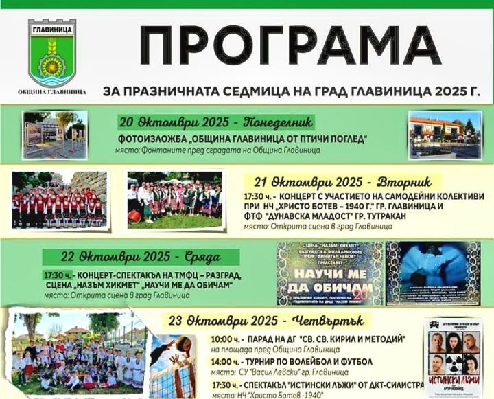 От 20 до 26 октомври 2025 г. Община Главиница ще отбележи празничната седмица на града с разнообразна програма от културни, музикални и спортни събития.