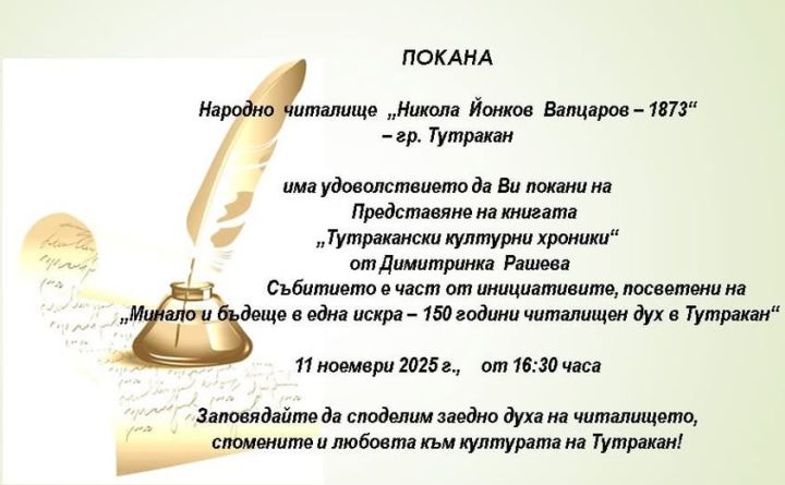 Тутракан ще бъде домакин на литературна проява, посветена на 150-годишнината на най-старото в района Народно читалище „Никола Вапцаров“. В рамките на събитието ще бъде представена родолюбивата книга с тутракански хроники на местния автор и изследовател Димитрина Рашева.